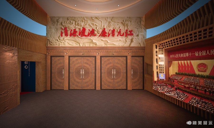 布展以“清源浚流,廉洁九江”为主题,内容分为序厅、清源厅、浚流厅、濯涤厅、沁润厅五大篇章,将常规廉政教育与九江廉政工作相结合,创造性地形成独具九江地方特色的廉政教育展示馆。