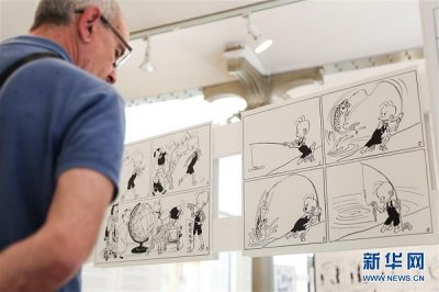 8月12日,在比利时首都布鲁塞尔比利时漫画博物馆,游客观看展出的中国漫画《三毛流浪记》。 比利时是丁丁和蓝精...