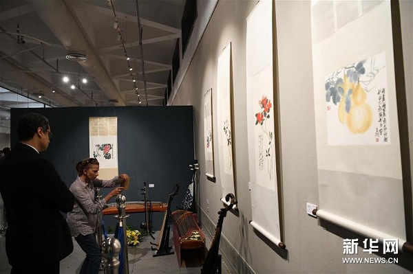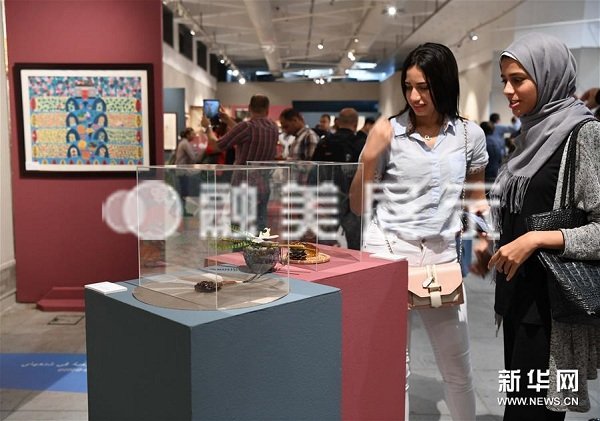 8月8日,在埃及亚历山大,人们参观“文化越古今——生活中的上海非物质文化遗产展”。新华社记者邬惠我摄