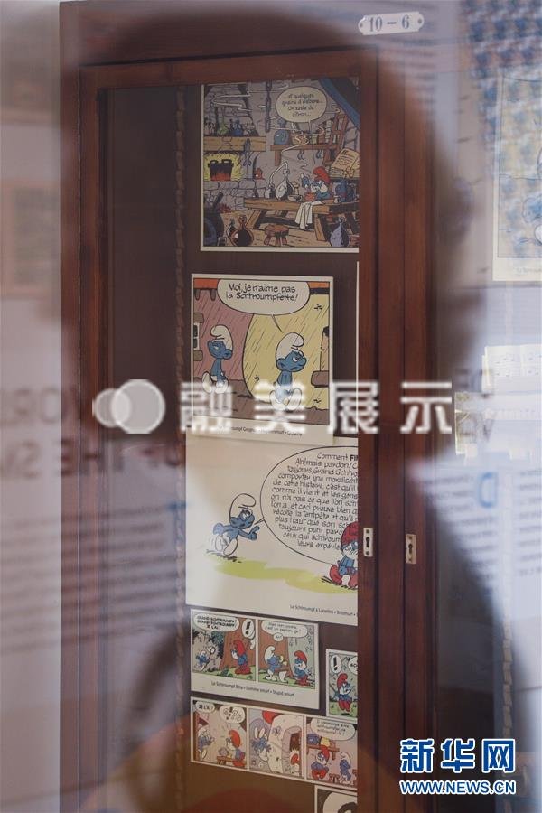 8月12日,在比利时首都布鲁塞尔比利时漫画博物馆,一名游客经过展示蓝精灵漫画的橱窗。 新华社记者郑焕松摄
