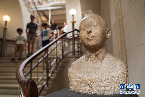 这是8月12日在比利时首都布鲁塞尔的比利时漫画博物馆拍摄的丁丁漫画形象雕塑。 新华社记者郑焕松摄